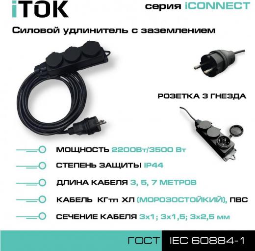 iTOK Силовой удлинитель с заземлением серии iCONNECT КГтп-ХЛ 3x2,5 мм 3 гнезда IP44 ГОСТ 3 м i-CONNECT-SU-KG-325-3-44-3